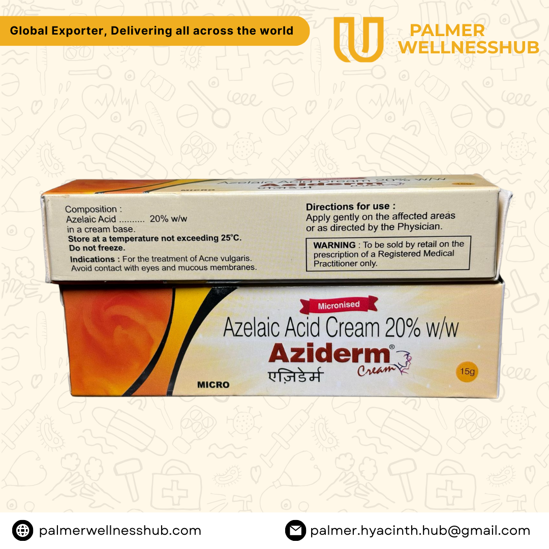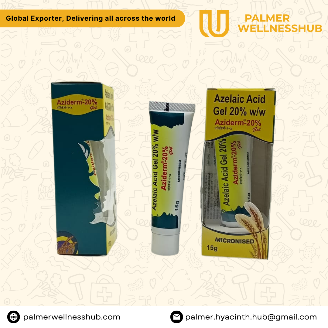 Azelaic Acid 20% Gel (Aziderm) is a dermatologist-prescribed topical therapy used to treat acne, melasma, post-acne pigmentation and skin discoloration. It works by reducing melanin production, fighting acne-causing bacteria, and decreasing inflammation.